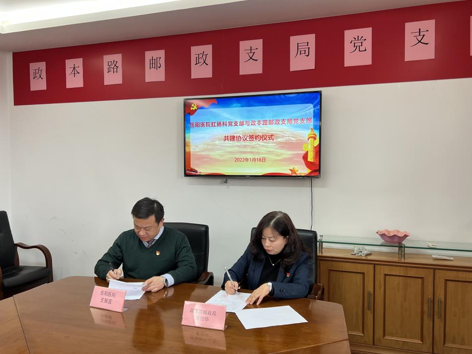 1月18号下午,bat365官网附属岳阳中西医结合医院肛肠科党支部与政本路邮政支局党支部举行党建共建签约仪式。医院肛肠科党支部书记王振宜、政本路邮政支局党支部书记童怡华及双方党员代表参加了共建签约活动。