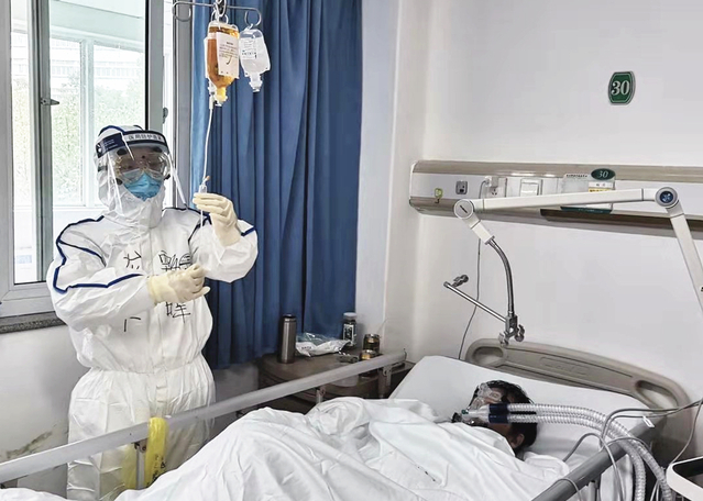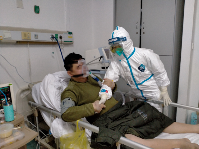上海市第一批援鄂医疗队队员 龙华医院呼吸科护士长甄暐主管护师在为患者做治疗