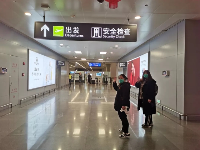 1月24日晚上上海市中西医结合医院呼吸科护士严晓晴和脉管科护士冯昱桦在机场告别