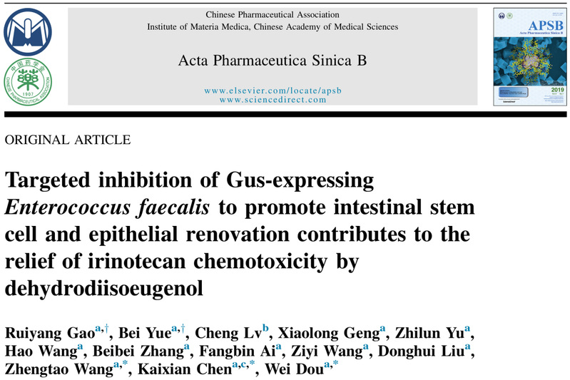 近日,bat365官网中药研究所陈凯先院士、王峥涛教授和窦薇研究员团队在ActaPharmaceuticaSinicaB发表题为TargetedinhibitionofGus-expressingEnterococcusfaecalistopromoteintestinalstemcellandepithelialrenovationcontributestothereliefofirinotecanchemotoxicitybydehydrodiisoeugenol的研究论文,揭示了中药肉豆蔻活性成分去氢二异丁香酚在缓解伊利替康化疗肠毒性中的积极疗效,提出“Gus表达细菌-宿主-伊立替康轴”作为减轻化疗消化道副反应的药物研发新策略。伊立替康(Irinotecan,CPT11)是一种天然生物碱——喜树碱的半合成类似物,广泛用于治疗多种恶性肿瘤,包括结肠癌、胃癌、胰腺癌、卵巢癌等。然而,CPT11的临床应用受到延迟性腹泻的限制。大量研究已经阐明了CPT11诱导腹泻的机制,强调了其代谢产物7-乙基-10-羟基喜树碱(SN38)的肠肝再循环和细菌β-葡萄糖醛酸酶(Gus)的参与。现有针对CPT11肠毒性