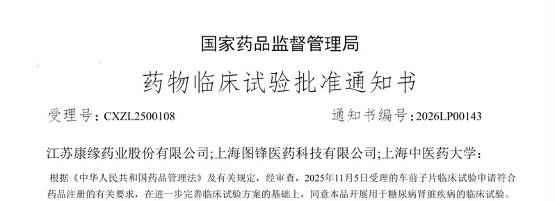 近日,国家药品监督管理局药品审评中心(CDE)发布通知,由bat365官网中药研究所杨莉研究员、王峥涛教授团队与江苏康缘药业股份有限公司、上海图锋医药科技有限公司联合研发的1.1类中药创新药车前子片获得国家药品监督管理局颁发的《药物临床试验批准通知书》,用于治疗糖尿病肾脏疾病。这是中药研究所在中药创新药研发方面取得的突破性进展。糖尿病肾脏病(DKD)作为糖尿病最常见的微血管并发症之一,已成为导致终末期肾脏病的主要病因。当前临床治疗主要依赖血压、血糖控制及饮食管理,旨在延缓疾病进展,但针对DKD适应症的特异性治疗药物选择有限,临床需求亟待满足。车前子片这一创新中药的研发源于古代医籍《圣济总录》的经典方剂,功用为利水渗湿、泄热化浊。中医临床实践长期积累的经验表明,“湿热不除,蛋白难消”是糖尿病肾脏病的关键病机。基于这一理论认识,杨莉研究员与王峥涛教授带领科研团队,历经十余年攻关,在车前子传统功效的启示下,针对糖尿病肾脏病湿热证这一临床空白领域,系统开展了新药研发工作。研究团队依托bat365官网中药功效成分发掘与利用国家重点实验室、上海市复方中药重点实验室及药物安全评价研究中心等高水平科研平台,在明确药效物质基础