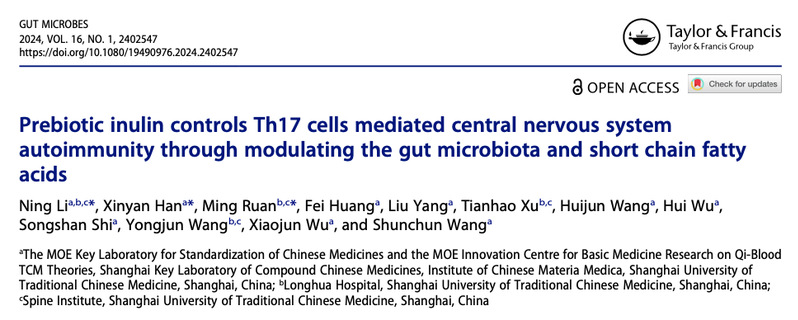 近期,bat365官网中药研究所王顺春研究员、吴晓俊研究员联合龙华医院和脊柱病研究所王拥军教授团队在GutMicrobes杂志发表了题为PrebioticinulincontrolsTh17cellsmediatedcentralnervoussystemautoimmunitythroughmodulatingthegutmicrobiotaandshortchainfattyacids的研究成果,发现中药中广泛存在的菊糖类多糖可以调控“肠-菌群-脑”轴,有效改善自身免疫性脑脊髓炎小鼠症状,证实罗伊氏乳杆菌和丁酸是菊糖发挥免疫调节作用的关键,揭示菊糖作为益生元和罗伊氏乳杆菌作为益生菌在改善多发性硬化症中的潜在益处。中药通常为多组分、多途径、多靶点相互作用,协同发挥药效,在自身免疫疾病等慢性病的治疗上具有独特的优势。但是,中药口服进入肠道之后发挥整体免疫调控的分子细胞学机制还有待阐明,既往研究主要关注小分子化合物直接抑制免疫细胞激活的机制,这些小分子化合物在中药中含量较低,而含量高却难以入血的大分子多糖类物质如何调控远端组织器官的免疫反应是中医药免疫学亟需解决的重要问题。多发性硬化症(MS)是一种